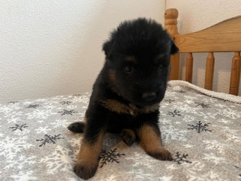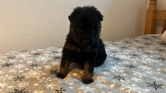 ist ein eher dunkler, aufgestellter Rüde mit mittlerem Temperament. Er lässt gerne seinen älteren Brüdern den Vortritt, ausser wenn es ums Essen geht, dort ist er immer bei den Vordersten. Ich könnte mir vorstellen, dass er ein eher grosser, aber sensibler Rüden werden wird.