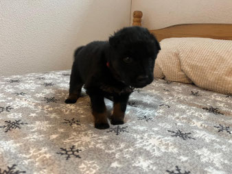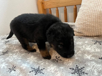 ist im Moment unser Grösster. Ein eher dunkler, aufgestellter, mutiger, aktiver Welpe. Er sucht aktiv den Kontakt zu mir und steht dabei schwanzwedelnd neben meinen Füssen und möchte auf den Arm genommen werden.